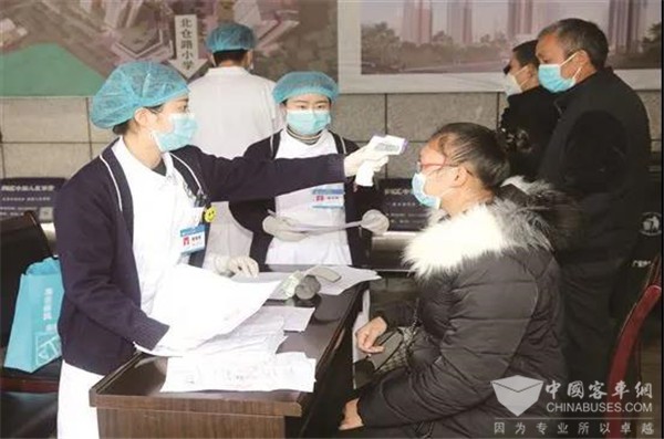 农民工乘坐返岗专车前进行体温检测