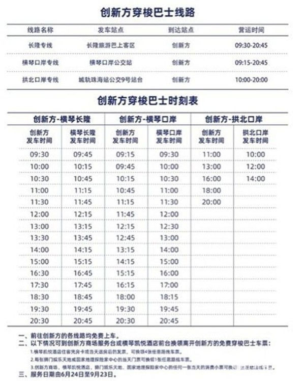 继2020年6月24日重新营业的消息后,横琴创新方11日再发布消息称,为方便广大游客,重新开业后将安排3条巴士专线为所有宾客提供免费接送服务。