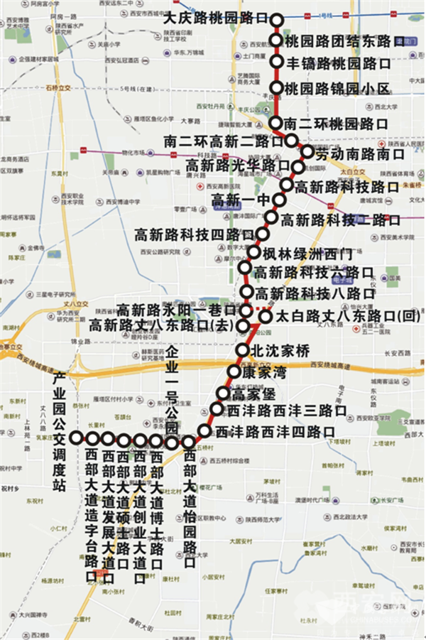 线路设置站点31个:产业园公交调度站、西部大道造字台路口、西部大道发展大道口、西部大道硕士路口、西部大道创业大道口、西部大道博士路口、企业一号公园、西部大道怡园路口、西沣路西沣四路口、西沣路西沣三路口、高家堡、康家湾、北沈家桥、高新路丈八东路口(去)、太白路丈八东路口(回)、高新路永阳一巷口、高新路科技八路口、高新路科技六路口、枫林绿洲西门、高新路科技四路口、高新路科技二路口、高新一中、高新路科技路口、高新路光华路口、劳动南路南口、南二环高新二路口、南二环桃园路口、桃园路锦园小区、丰镐路桃园路口、桃园路团结东路口、大庆路桃园路口。