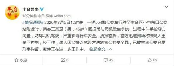 北京丰台公安分局官方微博7日发布通报称,2020年7月5日12时许,一辆554路公交车行驶至丰台区小屯东口公交站附近时,乘客王某卫(男,46岁)因投币与司机发生争执,过程中伸手抢夺方向盘,妨碍司机驾驶,严重影响行车安全。