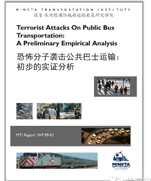 王健:诺曼·米内塔国际地面运输政策研究学院(MTI)的研究报告《恐怖分子袭击公共汽车:初步的实证分析》,提供了世界各地以公共交通为目标的恐怖主义袭击事件相关的数据,包括巴士、巴士车站被攻击的频率和杀伤力、死亡与伤害人数;与其它地面交通目标相比,公共巴士受到袭击的频率更多,这些数据有助于政府部门、运输企业经理和员工关注防止或减轻攻击常见的方法措施。