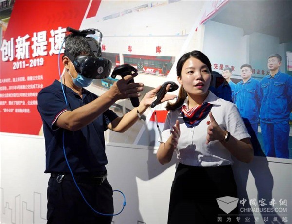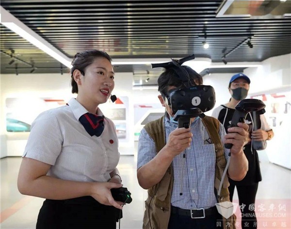 在展示馆的VR体验区,王丰余一行亲身体验了虚拟公交驾车,并时不时向身边工作人员分享了他的驾驶体验。
