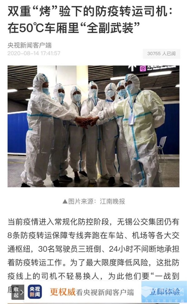 8月14日,央视新闻客户端报道了《双重“烤”验下的防疫转运司机:在50°C车厢里“全副武装”》