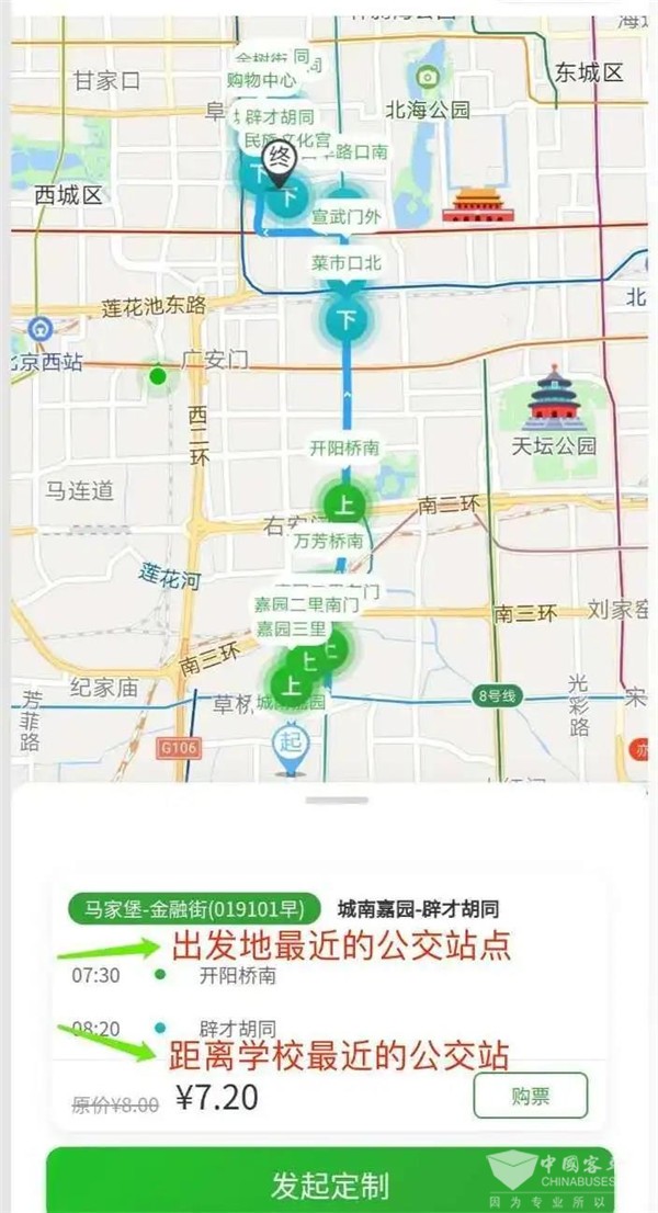 一是按照学校、家委会乘车需求提供住处往返学校,只服务于同一所学校的线路,中途可合理设置若干个站点。二是学校、家长通过“北京定制公交升级版”小程序提交线路需求,满足开线条件即可开通线路。