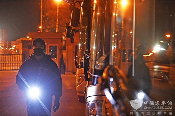 天还没有破晓,天津公交各运营公司管理上岗保早出库就已经各就各位了。遍布在市内建成区的公交场站内都是灯火通明,带班管理给驾驶员测量体温、班前酒精检测,进行面对面的班前安全教育,驾驶员给公交车做每日例保检查。