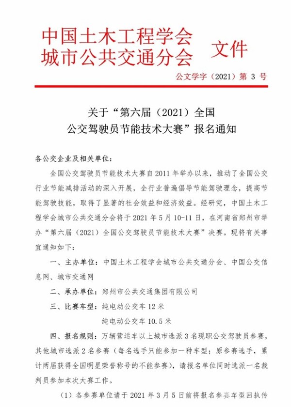 全国公交驾驶员节能技术大赛自2011年举办以来,推动了全国公交行业节能减排活动的深入开展,全行业普遍倡导节能驾驶理念,提高节能驾驶技能,取得了显著的社会效益和经济效益。经研究,中国土木工程学会城市公共交通分会将于2021年5月10-11日,在河南省郑州市举办“第六届(2021)全国公交驾驶员节能技术大赛”决赛。现将有关事宜通知如下: