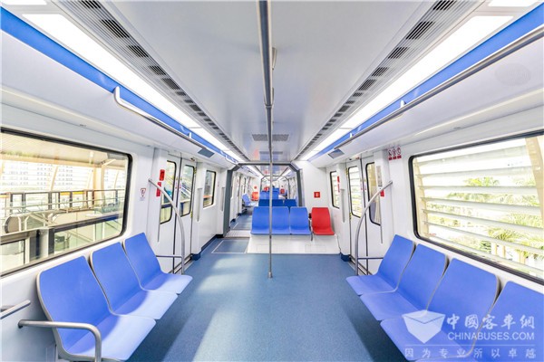 巴伊亚云轨车辆是全球首列下线的海外版云轨车辆,是比亚迪为巴西当地特别定制,符合当地规范、契合当地需求。车辆采用流线型设计,兼具设计美感与降低风阻;大规格车门,配合无障碍进出设计,无论行走、坐轮椅、推婴儿车都可以舒适出行;车厢连接处无阻隔,通透性好,侧面配备大车窗,景观性好;使用空气弹簧悬架系统确保了车辆行驶静谧、平稳。另外,车辆搭载了领先的全自动无人驾驶系统及智能乘客服务系统,实现列车高度自动化,可以按照最优模式提供更精准的运营控制、可靠性更高、安全性更好,提升运营效率、保障准点率;同时车载PIS、CCTV、紧急对讲等系统实时服务乘客、确保安全便捷的乘车体验。车辆后期也可以根据实际运力需求进行灵活编组。