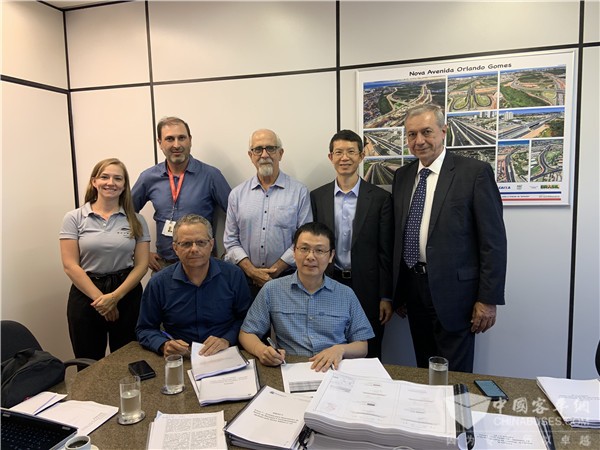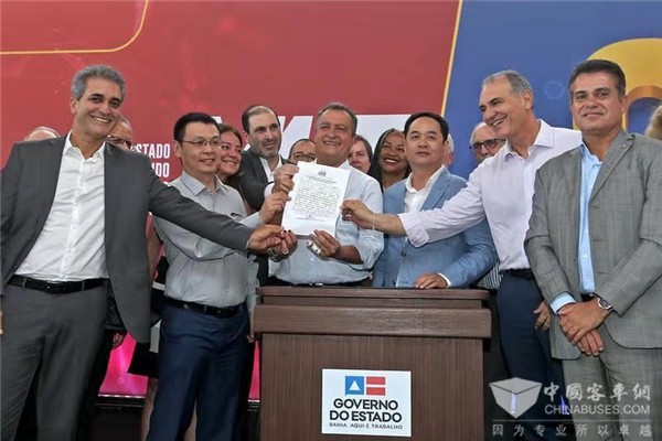 在巴伊亚州民政部长Bruno Dauster(后排中)的见证下,比亚迪巴西分公司总经理李铁与巴伊亚州交通运营公司CTB主席José Eduardo Ribeiro Copello共同签署整体设计方案合约