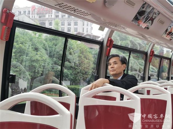 韩国驻上海总领事馆总领事金胜镐坐在双层巴士的第二层,欣赏沿途风景。新华社记者 陈爱平 摄