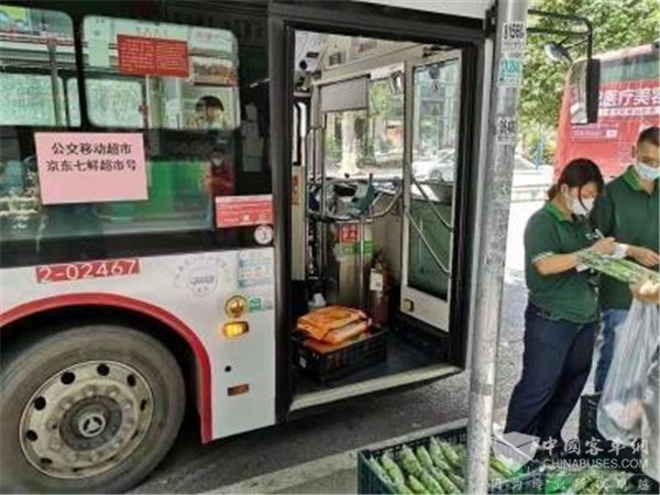广州市商务局和广州公交集团第二公共汽车有限公司提出打造公交移动超市的想法后,得到胜佳超市、京东七鲜超市、温鲜生、粤旺、华润万家、西亚兴安等超市的积极响应。早上7点,二汽的公交车开到指定地点装货,10点到达封控区域指定街道点位。