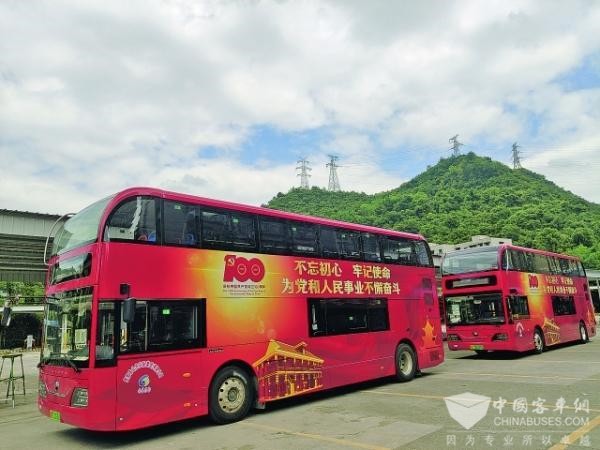 2021年6月26日,贵阳公交集团即将开行的“建党百年红色宣传公交专线车”亮相,崭新的红色双层纯电公交车整装待发。