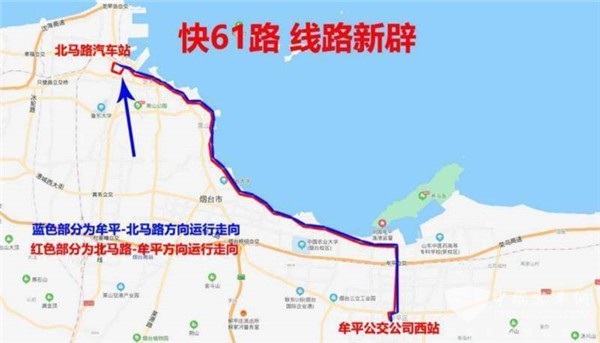 快61路由牟平公交公司西站发车,沿61路线路走向运行至北马路汽车站,受道路施工影响,下行由海德医院发往北马路汽车站,上行由北马路汽车站发往宏然琴行。下行:海德医院(单向)、宏然琴行、商业大厦、安德利花园、山海龙城、龙湖假日酒店、黄海游乐城(工商学院)、图书馆、二马路、北极星钟表、火车站、北马路汽车站。上行:北马路汽车站、火车站、北极星钟表、二马路、图书馆、黄海游乐城(工商学院)、龙湖假日酒店、山海龙城、安德利花园、商业大厦、宏然琴行。全程票价1元。