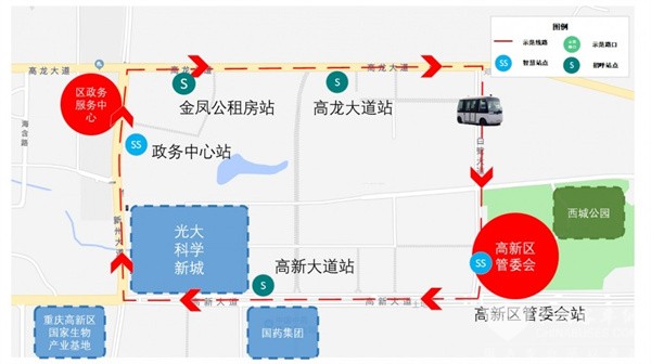 自动驾驶巴士接驳服务计划于8月底正式运营,共设西部科学城政务中心站、金凤公租房站、高龙大道站、西部科学城管委会站、光大科技新城站、国家生物产业基地站6个站点,运行时间覆盖上下班通勤高峰期,届时市民可通过专用微信小程序扫码乘车。
