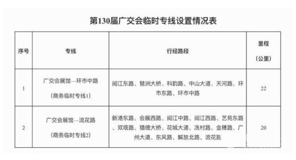 第130届广交会将于2021年10月15日至10月19日在琶洲广交会展馆举行。12日,记者从广州市交通运输部门了解到,为做好本届广交会期间客商输运工作,会展期间每日15:00至19:00(展期最后一天服务时间调整为13:00至16:00)开行“广交会展馆—环市中路”“广交会展馆—流花路”等2条公交临时专线。上述临时专线的票价按市发改部门核定标准实施。