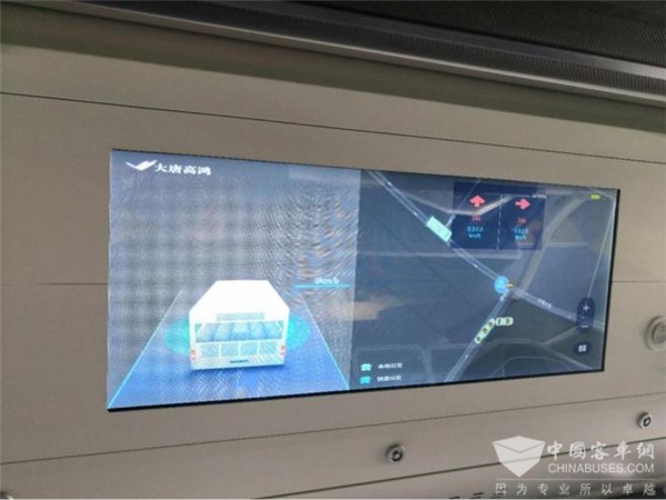 记者进入车内看到这台智能公交车内有四块屏幕:位于司机仪表板左侧的智能显示屏,可以显示车路协同功能的信息。在车厢风道屏左右两侧还各有一块智慧屏,其中一块屏幕内容与司机侧屏幕的内容同步,向乘客展示体验。而第四块屏幕用于显示车辆运行状态的信息。