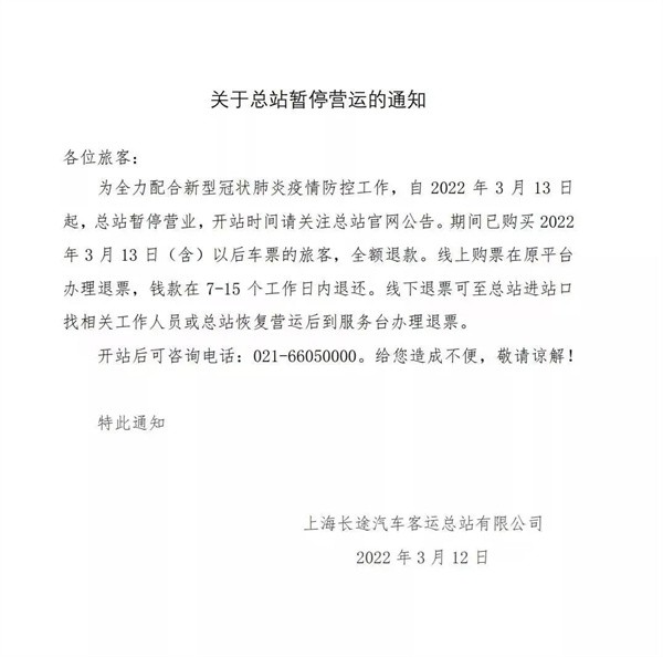另据了解,本市客运站自明日(3月14日)起将全部暂停营运。市道运中心要求停运的客运站做好公示,对已购票旅客全额退款并做好解释工作。