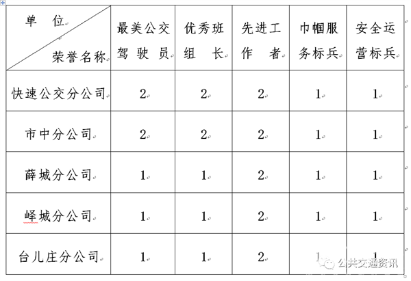 最美公交驾驶员7名;优秀班组长7名;先进工作者10名;巾帼服务标兵5名;安全运营标兵5名。