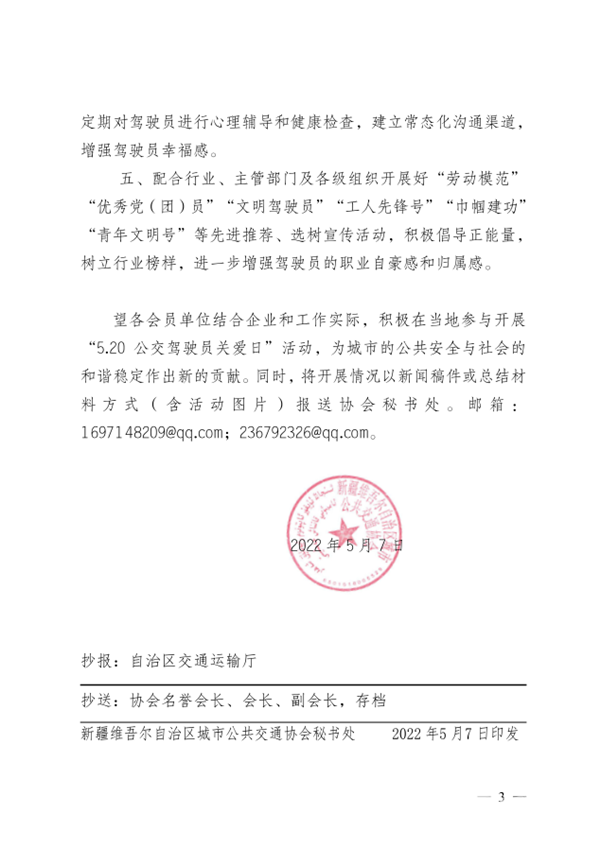 望各会员单位结合企业和工作实际,积极在当地参与开展“5.20 公交驾驶员关爱日”活动,为城市的公共安全与社会的和谐稳定作出新的贡献。同时,将开展情况以新闻稿件或总结材料方式(含活动图片)报送协会秘书处。