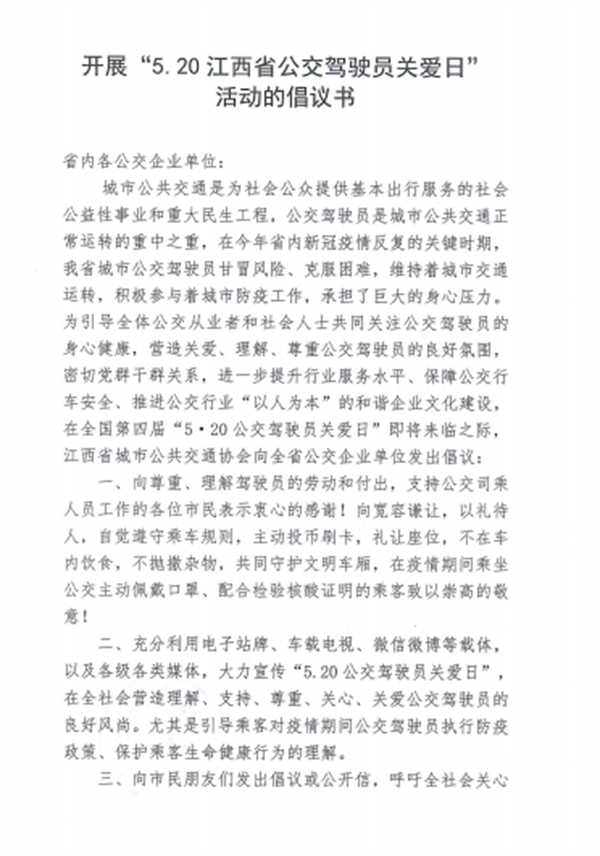 江西公共交通协会倡议:积极开展第四届“5.20公交驾驶员关爱日”活动