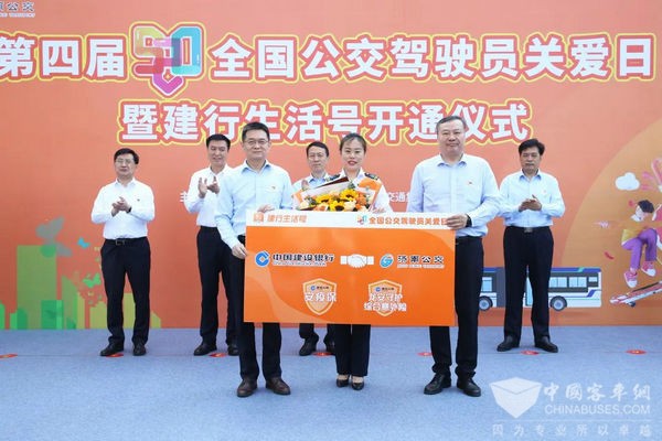 中国建设银行相关领导向济南公交驾驶员代表董丹赠送“520关爱驾驶员保险和建行生活专属权益礼包”。
