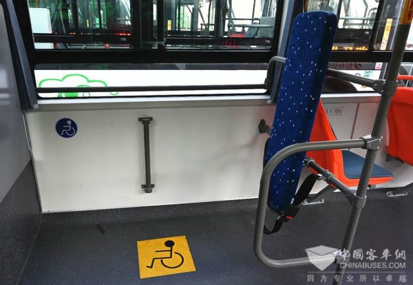 车厢设置无障碍设施,并在轮椅停放区域加装了一个门铃按钮,方便特殊乘客上下车。