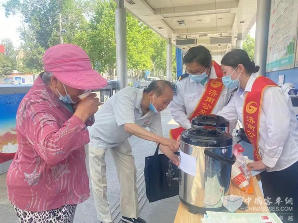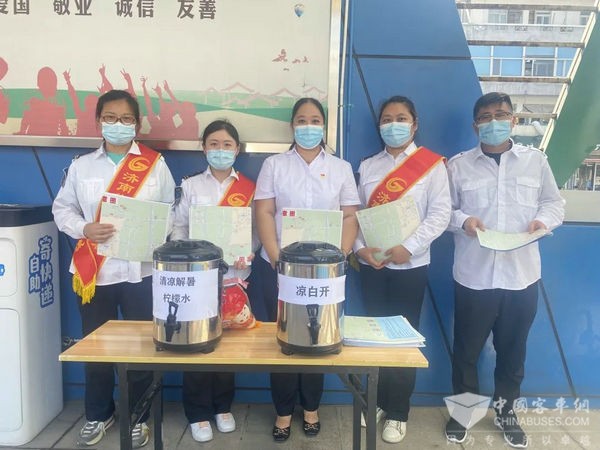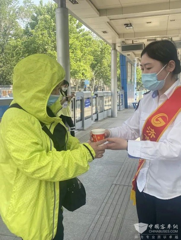 在解放桥BRT站台,高星级站务员杜筱晗等提前为等车的市民乘客免费提供矿泉水、蜂蜜柠檬水等解暑饮品,同时,向乘客们现场讲解“夏季防暑小妙招”以及出现中暑症状后的应急处理方式,得到市民乘客的一致好评。活动结束后,高星站务员边珂、项静等人还为辛勤工作的环卫工人及交警送上端午祝福和清凉饮品,感谢他们的付出让泉城更加美好和谐。
