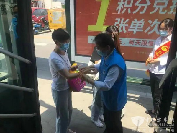 香甜的粽子出锅后,工作人员将粽子晾好、装袋,来到十里河站点,同时,车队还准备了五彩手绳,准备一起将美好的端午祝福送给乘坐公交车的乘客,并祝福大家“端午安康”!