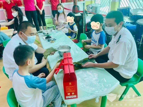 活动中,高星级驾驶员张欣、韩建伟与启明星的老师、家长和孩子们一起动手挂艾草、缝香囊、包粽子、搓彩绳、做游戏,让孩子们知道五月初五有画彩蛋、系彩绳、吃粽子、插艾条、储草药等端午节日习俗,与孩子们度过一个欢乐的端午佳节。
