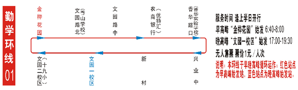 勤学环线在服务时间段内不间断、循环发车,请学生合理安排出行计划;勤学专线有固定发车时间,请提前到达公交站点候乘,并有序排队乘车,营造文明良好的乘车环境。