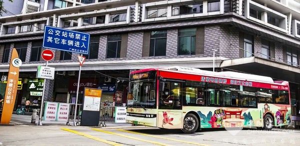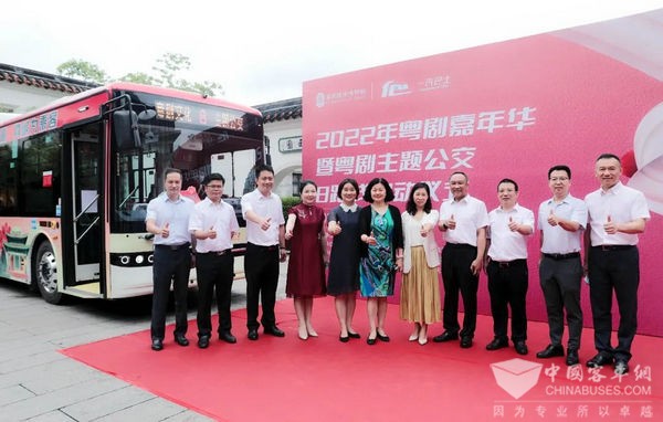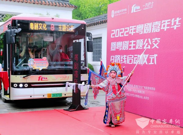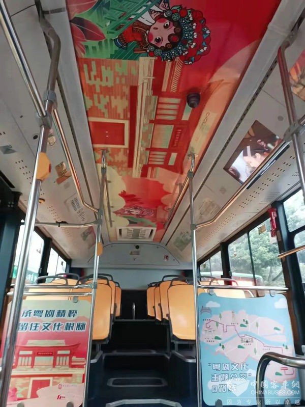 在2022年粤剧嘉年华上,两台穿着“粤剧戏服”的公交车吸引着众多市民拍照打卡。本次主题车辆一台为红色调、一台为绿色调,寓意着粤剧历史源远流长,曲艺百花齐放。车身以粤剧艺术博物馆为主要外观,生、旦、净、末、丑等Q版粤剧角色文化,车内天花、宣传灯箱等全方位进行粤剧介绍。
