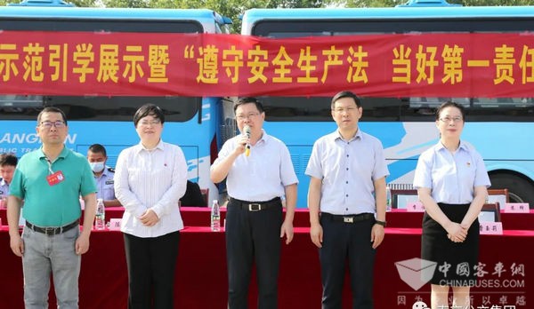 为进一步掀起全员大培训热潮,增强遵法守法保安全的自觉,不断提升公交服务意识和服务品质,根据“公交服务质量提升年”和“安全生产月”活动要求,6月16日上午,公交集团举办“赋能提升蓄力发展”全员大培训示范引学展示暨“遵守安全生产法当好第一责任人”安全生产月主题活动。市城建集团总经理李雁,市总工会党组成员、副主席陈慧男,劳动经济工作部副部长焦霞,鼓楼区人大主任陆敏,中央门街道工委书记马蓉,市交通运输局一级调研员兼运输处处长刘向东,综合行政执法监督局一支队队长邓智勇,市公安局公交治安分局政委甘建文,内保大队大队长彭亮,副大队长崔琰森,乘客委员会秘书长郎亮,还有部分人大代表、乘客代表以及公交集团领导班子成员,所属公司中层干部、示范引学教员、一线职工代表参加了活动。活动由公交集团副总经理王彤彦主持。