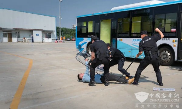 警车呼啸而来,警察将歹徒制伏押上警车。急救车也赶到现场,对“受伤”的巡检员进行询问、检查和包扎处理。至此,公交车突发事件应急处置演示按规范流程操作完毕。
