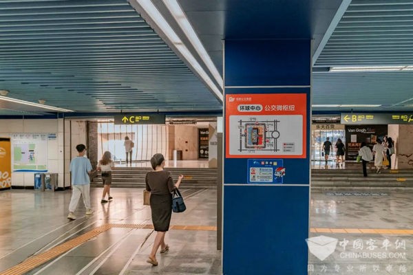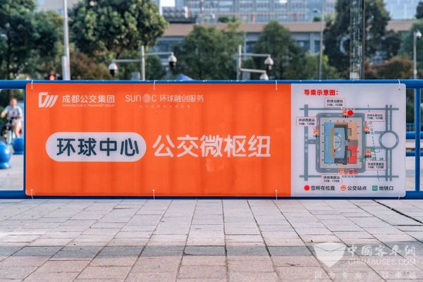 环球中心出入口、地铁锦城广场站出入口均设有导视牌,醒目引导市民前往“微枢纽”乘车点位。