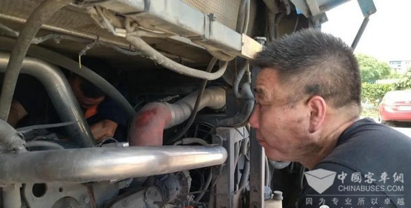 刘志虎既是党员,又是组长。在持续高温下,他身先士卒,带领组员们一起检修车辆。连续高温,报发动机故障的情况也明显较平时多。庞建和毕盛荣正在检查维修发动机故障,虽然发动机关闭了,但是车的部件仍然冒着热气,机舱内的温度可想而知。而且为了能够准确无误的找出发动机的毛病,在检修过程中,也需要一次甚至多次开启发动机,滚滚热浪扑面而来,相当“烤”验人的意志。“如果不尽快修好让车辆上路运行,驾驶员会急,乘客也会急。”庞建说,他们对高温已习以为常。