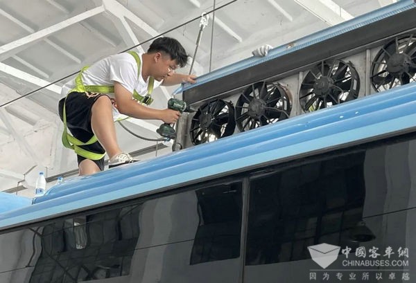 在炎热的夏季,公交车空调的好坏直接影响到乘客的舒适度。车间空调组未雨绸缪,在未进入夏季之前,便与车队协调,车间要求车辆一保时检查空调是否完好。若检查异常,及时修复。这一举措避免了夏季高温时车辆空调维修扎堆进场,更先一步解决了部分车辆的空调问题,让驾驶员能够在高温天气从容面对。
