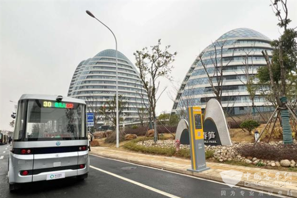国内首个24小时服务的车路协同无人驾驶接驳巴士“春笋号”。记者郝天娇 摄