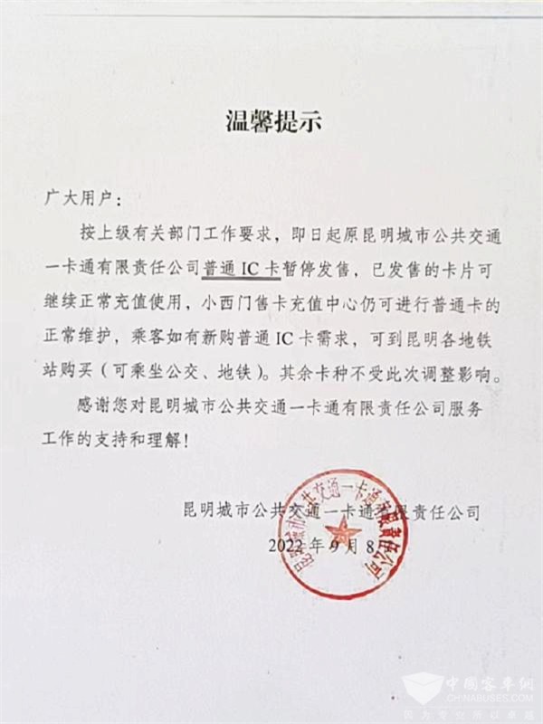2005年7月1日,昆明公交开始推行IC卡自动收费系统,先后推出普通卡、优惠卡、学生卡、爱心卡等种类公交IC卡。公交普通IC卡运行17年后,9月8日起,原昆明城市公共交通一卡通有限责任公司普通IC卡暂停发售。