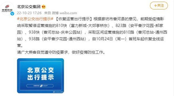 北京公交集团2022年10月23日发布恢复运营出行提示称,根据廊坊市香河县的意见,前期受疫情影响采取暂停运营措施的810快(富力新城-大郊亭桥东)、823路(安平香汐花园-郎家园)、938快(香河总站-庆丰公园站),采取区间运营措施的810路(香河总站-通州西站)、938路(安平香汐花园-通州西站),自10月24日(周一)首班车起恢复全线运营。