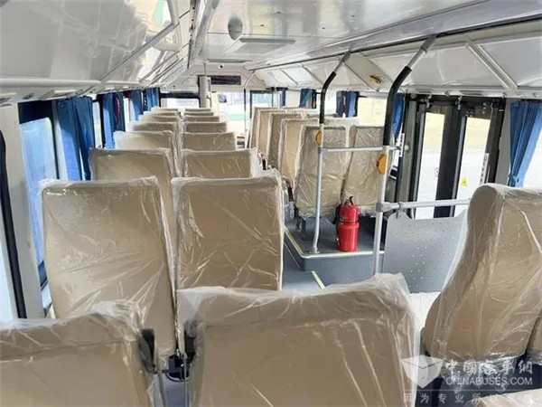 记者在车内看到,与常规公交车相比,该款车的车厢内除了装置投币机、IC卡机、易燃易爆物品检测仪、安全锤、“一键报警”、车身升降系统、360度环视系统和电加热后视镜等设备外,还有诸多亮点:座椅采用软面皮质包裹、座椅安全带、安全扶手均有配置。在配有传统安全锤及爆玻器的基础上,车身左侧新增了安全逃生窗及安全逃生门,大大提高了乘车舒适度及车辆安全系数。