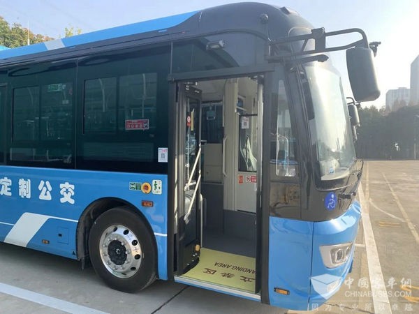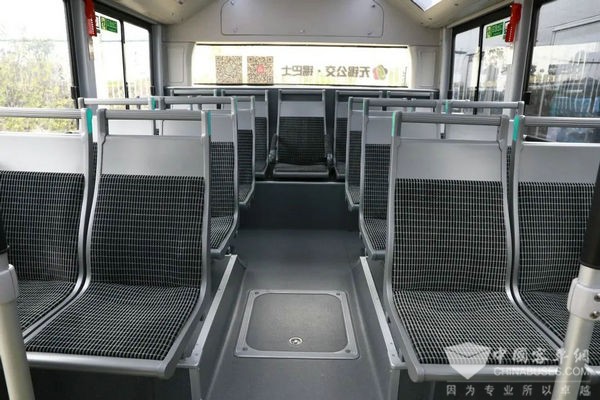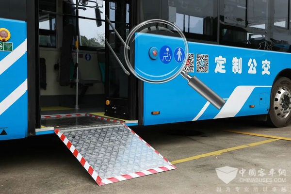 除此之外,在车厢中部和车外后门旁都安装了特殊人群一键呼叫按钮,和轮椅专用停靠区,按下按键后,仪表台上就会出现提示音,驾驶员就会放下后门处的无障碍翻板,方便特殊人群上下车。