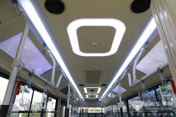 车厢内的式样和色调采用整体设计,配有铝合金集成吊顶,带加绒的铝合金座椅,内沉式螺钉的铝合金扶手及防滑耐磨的石英砂地板等。同时,车内还配有LED氛围灯带和灯环,营造出一种温馨又时尚的氛围。