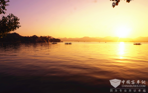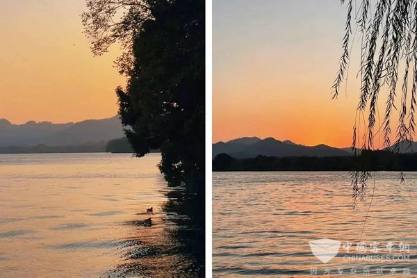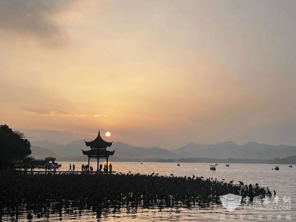 日落时分,微微泛红的夕阳洒向湖面,集贤亭与来来往往的人以及远处的船只共同形成剪影,令人无限遐想。