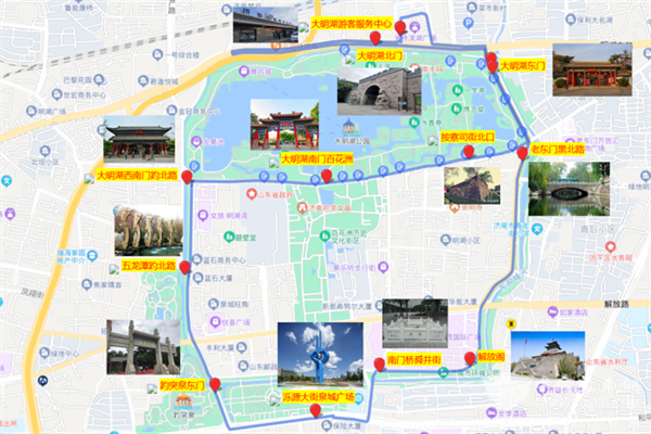 沿途经过9条道路,设置14个站点:大明湖游客服务中心→大明湖北门→大明湖东门→按察司街北口→大明湖南门百花洲→大明湖西南门趵北路→五龙潭趵北路→趵突泉东门→泺源大街泉城广场→南门桥舜井街→解放阁→老东门黑北路→大明湖东门→大明湖游客服务中心。