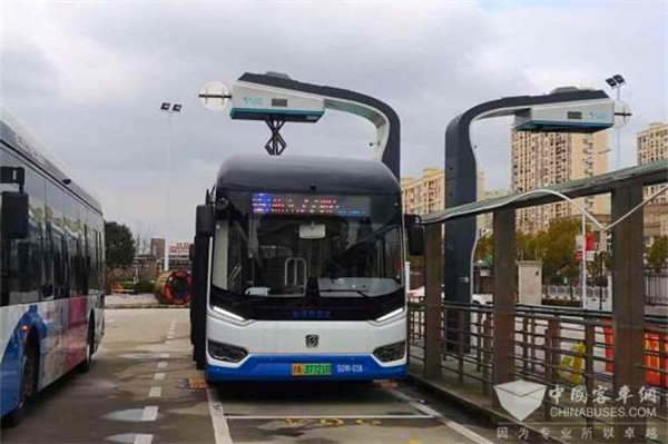 在金葵路金槐路的公交首末站点,公交车进站停靠后,上方的一个充电弓缓缓降下为下方的公交车充电,几分钟后公交车的电量又满格了。