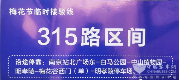 1、315路(南京站南广场西——马高路西),配车10台。客流高峰期间增车2-5台。2、20路(莫愁湖公园西——明孝陵停车场),配车11台。客流高峰期间增车2-5台。以上2条线路还根据客流情况适时调配运力,确保客流疏散。