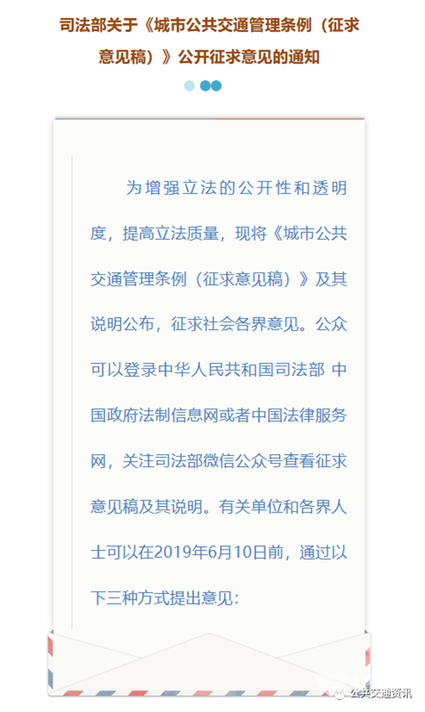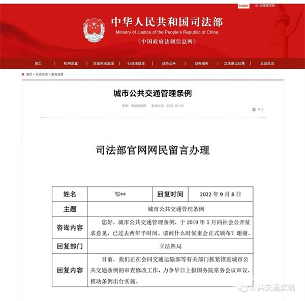 ★ 2022年9月8日,司法部官网公开了社会持续关心关注《条例》出台一事,给予了解答。社会人士邹某某询问:“您好,城市公共交通管理条例,于2019年5月向社会公开征求意见,已过去两年半时间。请问什么时候可以正式颁布?谢谢。”司法部立法四局给予的答复是,“目前,我们正在会同交通运输部等有关部门,抓紧推进城市公共交通条例的审查修改工作,力争早日上报国务院常务会议审议,推动条例出台实施。”