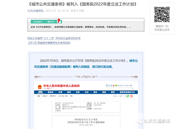 ★ 2022年7月5日,国务院办公厅印发《国务院2022年度立法工作计划》,其中《城市公共交通条例》(交通运输部起草)被列入拟制定、修订的行政法规第一条。