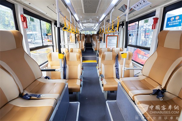 2021年8月4日,成都红砂村公交站附近的公交场站内,“新式公交车”亮相。从外形来看,该车外表为红色涂装,与旁边的车型并无太大差别。仅前车侧的显示屏有所增大,更大的字体更便于老年人辨识。对于市民来说,车辆最大的不同在于座椅的升级。车厢内的座椅从传统硬制塑料椅改成真皮座椅,座椅上增加了扶手、安全带;座椅靠背角度可自行调节,提升了乘客的乘坐舒适度;而可以放杯子的杯架、类似飞机上才有的小桌板、舒适的脚踏,则更凸显人性化。