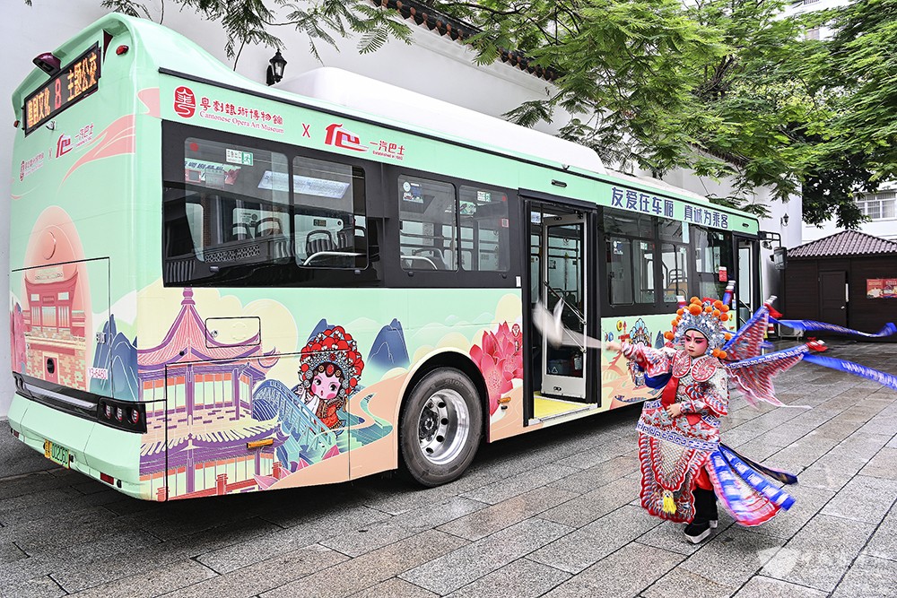 2022年6月8日,粤剧艺术博物馆成立6周年当天,全国首条“粤剧文化主题公交”——8路线路在广州市开通。通过公交这一流动的城市窗口融合粤剧文化,展现千年商都广州作为岭南文化中心的魅力,让非遗走出“橱窗”。图为一名粤剧小演员在粤剧文化主题车辆前表演。