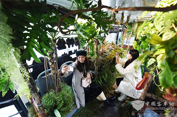 2019年11月22日,太原,一辆“森林公交”亮相街头,车厢内种植有上百种植物,吸引不少市民游客专程前来“打卡”。“森林公交”设计者希望通过这种形式呼吁市民选择绿色低碳的出行方式。